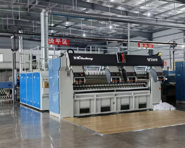其次,增加生产线和优化洗涤流程,这里小编重点推荐的设备有:百强高速熨平线和百强枕套熨平线,高速熨平线由四工位展布机、高速熨平机、高速折叠机组成,熨烫速度至高可达60米每分钟。